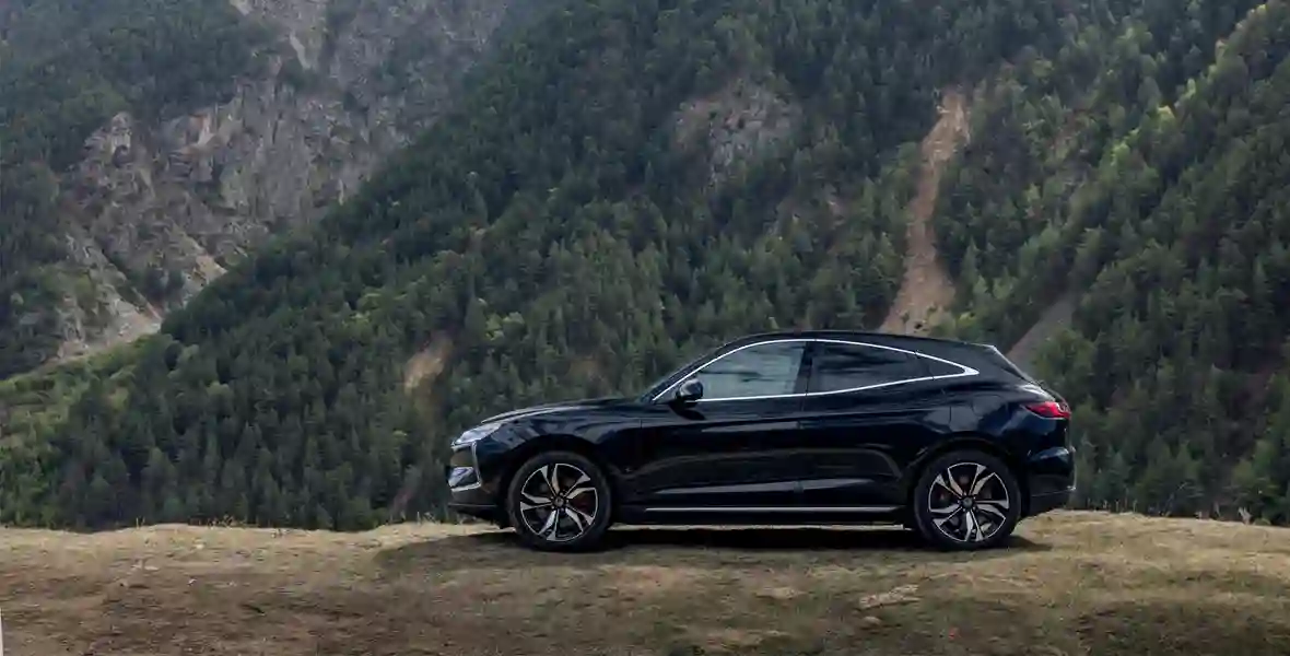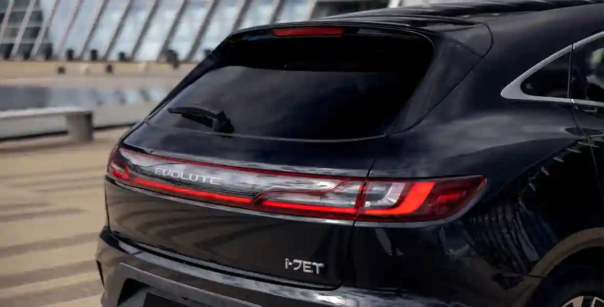 Формой кузова EVOLUTE i‑JET напоминает о Porsche Macan — особенно похожа задняя часть, где с немецким спортивным кроссовером его роднят не только светодиодные фонари во всю ширину, но и расположенная на креплении стеклоочистителя кнопка открывания двери багажника.